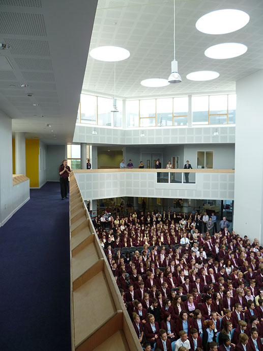The school is designed to experiment with a flexible teaching method by creating a series of open plan teaching spaces at the end of each school. These spaces are flexible and designed to allow them to easily adapt a traditional classroom layout. The building is a successful learning and teaching environment with a strong identity that the community can be proud of.